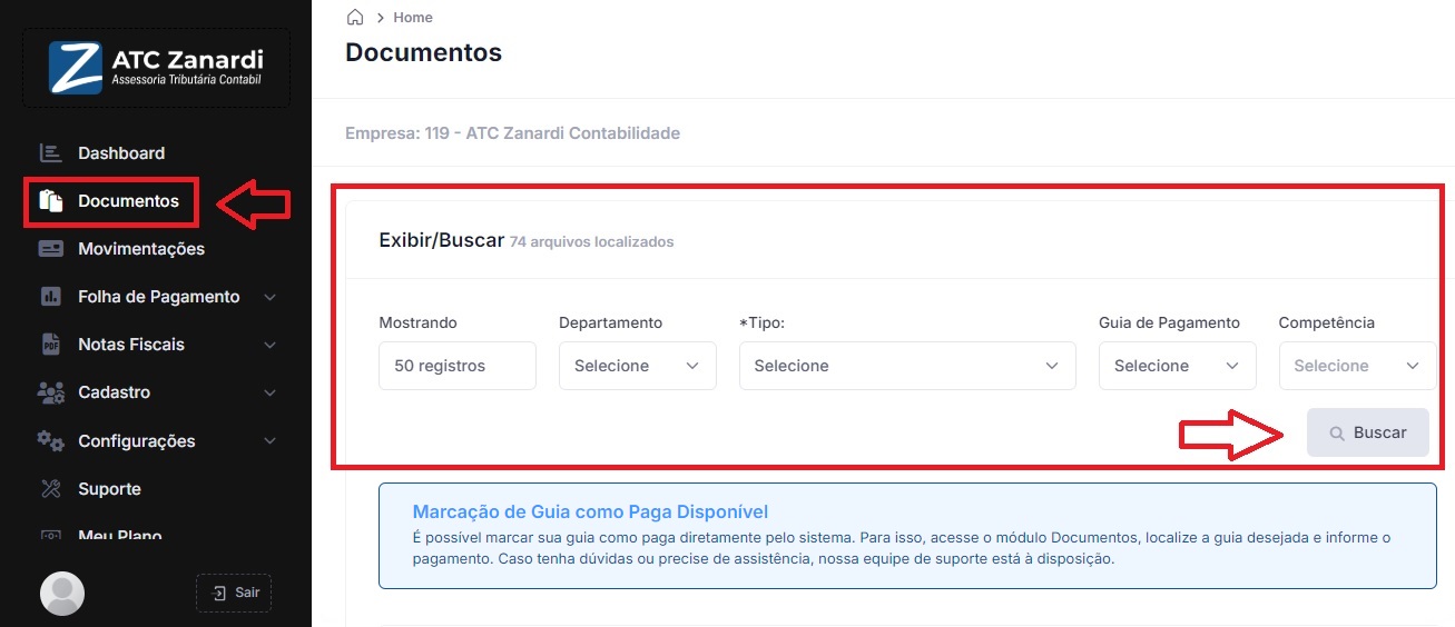 Buscar ou Filtro Avançado: Para localizar um documento, relatório ou imposto é possível informar nos campos de filtro a opção desejada e clique em buscar para atualizar a lista de arquivos demonstrados.