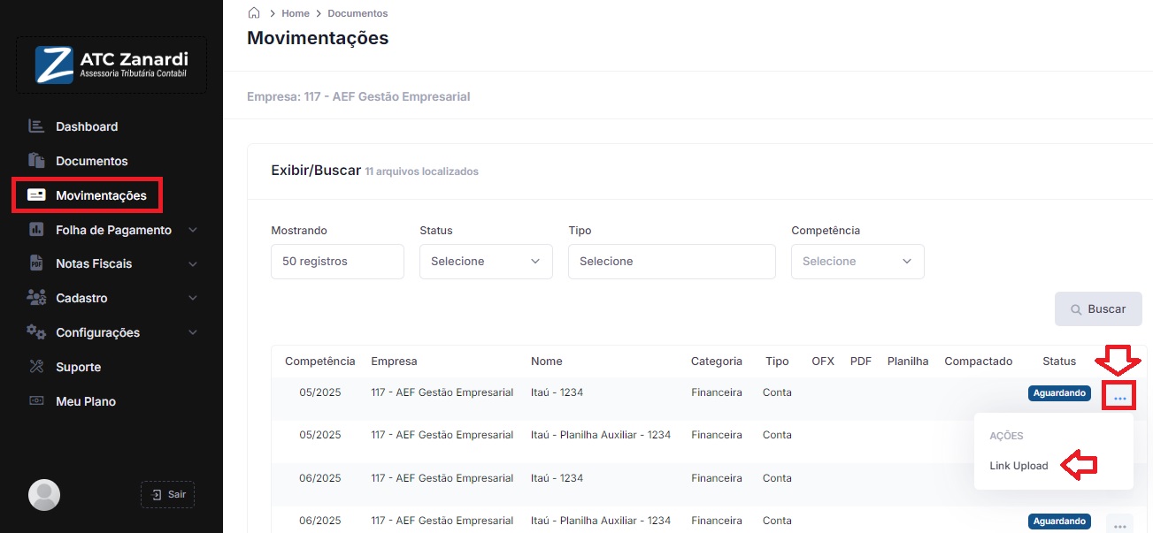 Para enviar a movimentação financeira ou fiscal, clique nos (3… pontinho) na linha da movimentação e clique em “Link Upload.