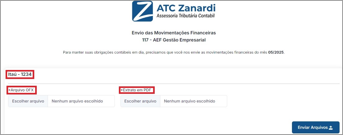 Na tela de Upload da movimentação financeira ou fiscal, clique no botão “Escolher Arquivo”. O tipo de arquivo a ser enviado deve corresponder ao tipo do arquivo solicitado pela ATC Zanardi (OFX, XLS ou PDF)