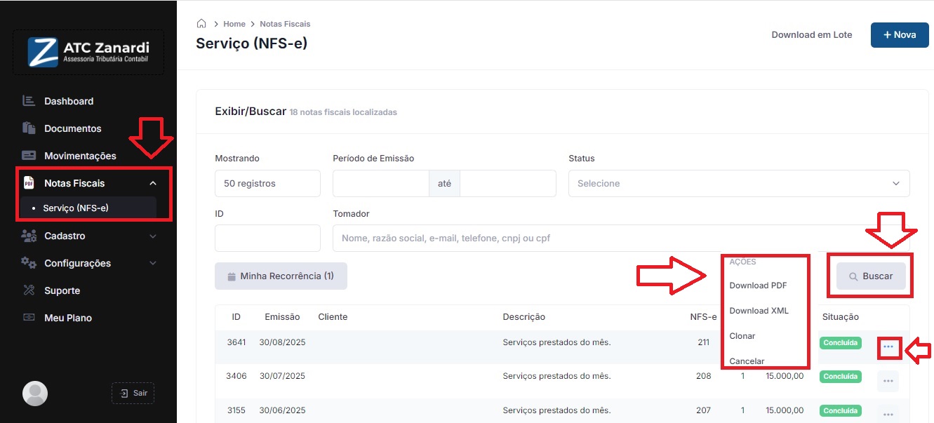 Visualização das Notas Fiscais Emitidas: Para visualizar a nota fiscal de serviço emitida ou realizar o download do arquivo XML, basta clicar nos (… 3 pontinhos) na linha da nota fiscal e selecionar a opção (Download PDF ou Download XML)