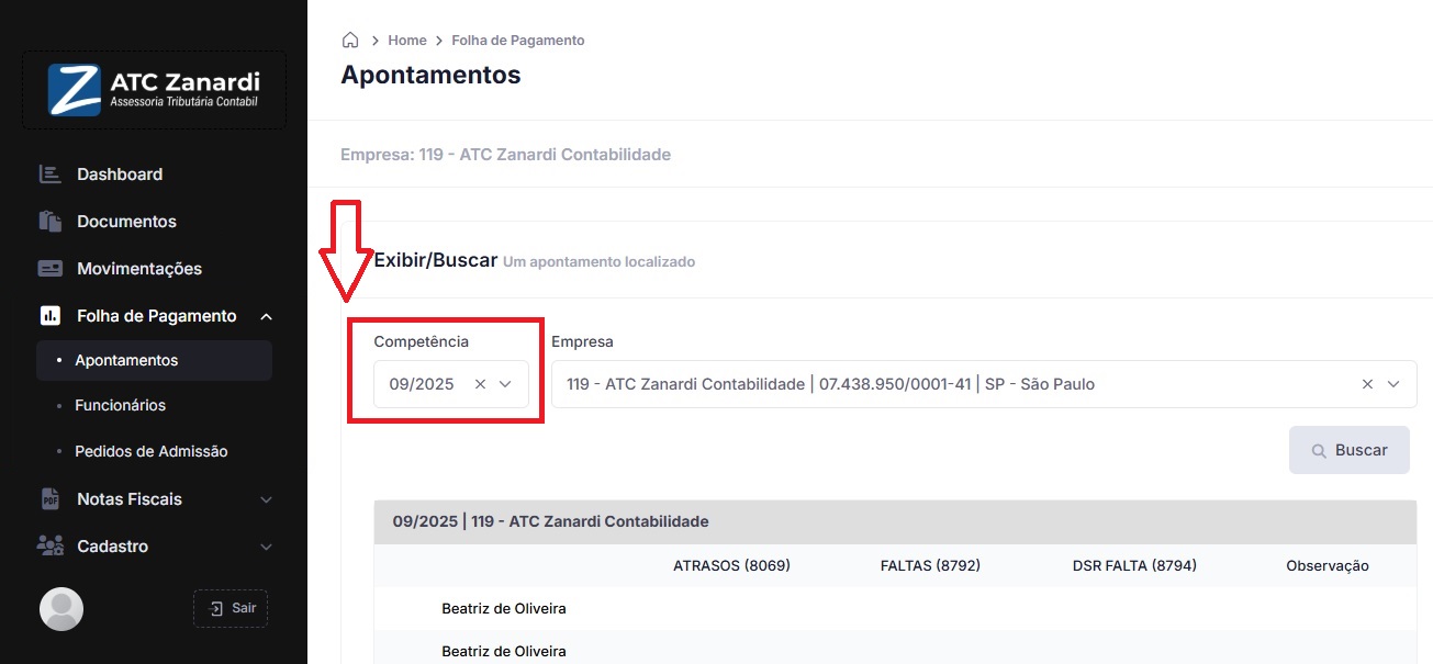 Na tela de apontamento selecione o mês/competência dos apontamento que serão inseridos.