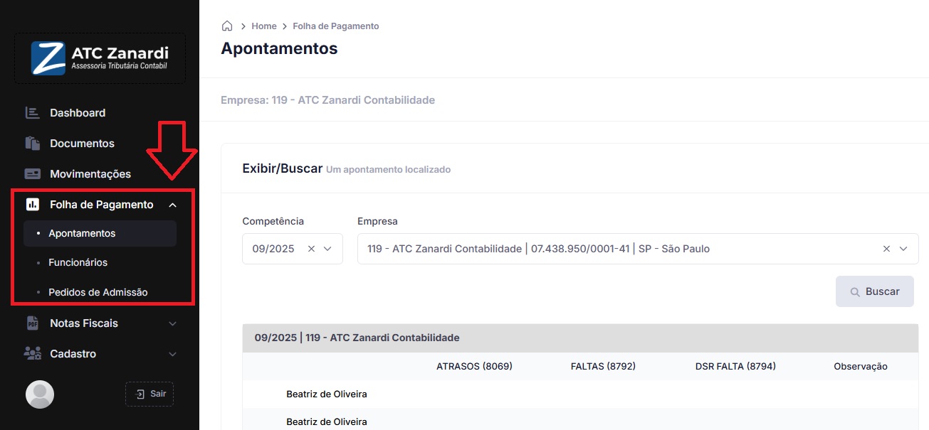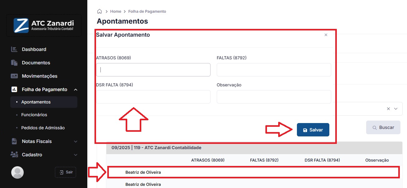 Clique sobre o nome do funcionário que deseja inserir um apontamento, insira os apontamentos e clique em salvar.